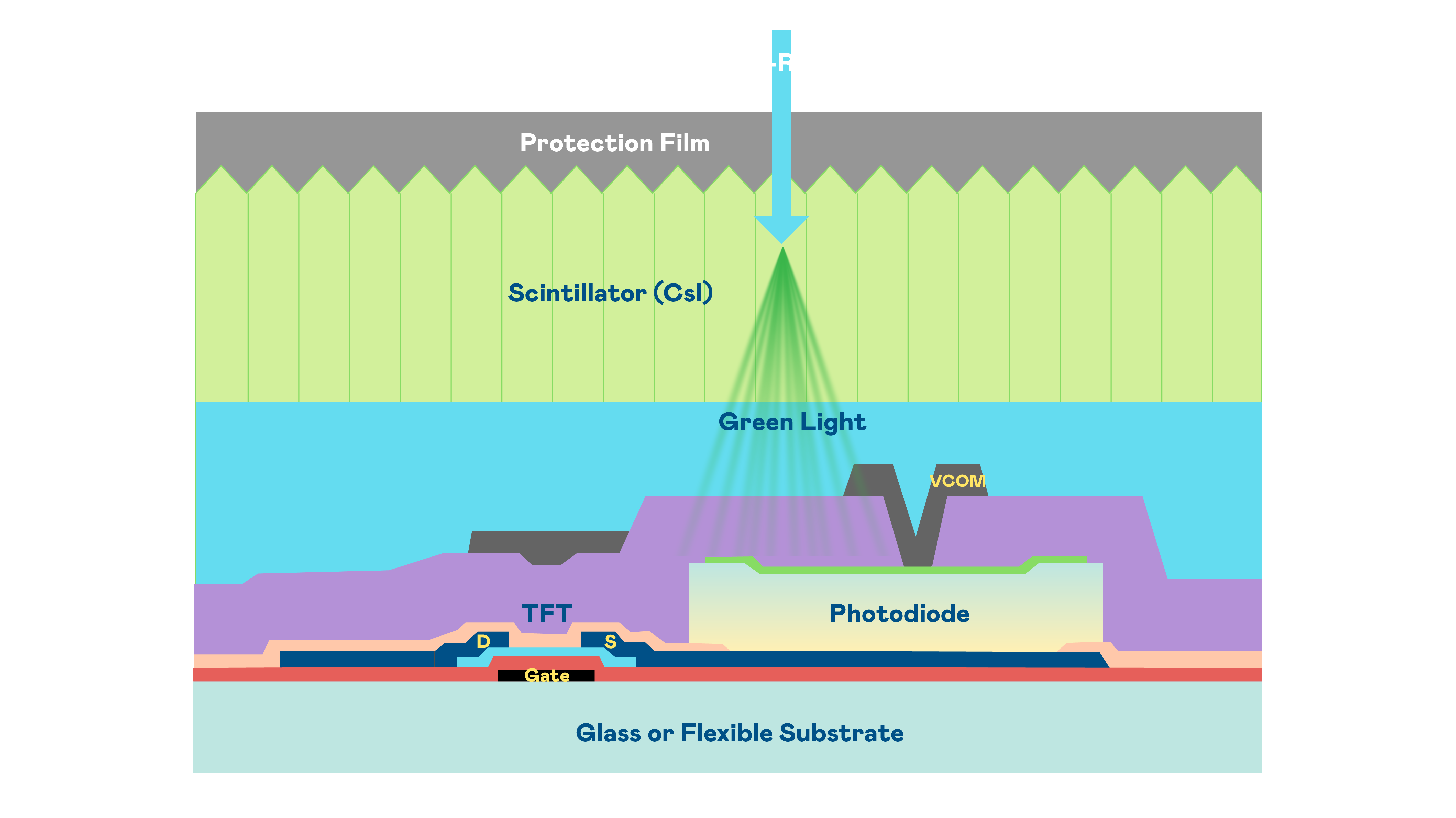 yd12399云顶集团的X光影像感测阵列使用薄膜电晶体 (TFT) 作为每个像素的读取开关,搭配光电二极体(Photodiode)的光电转换元件,用以感测X光影像讯号。